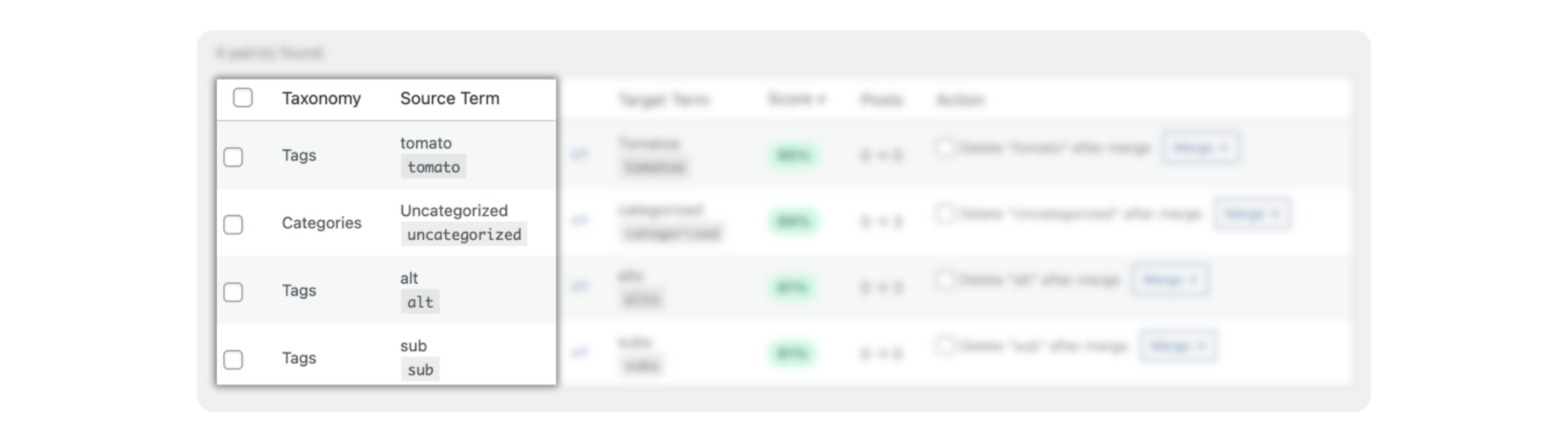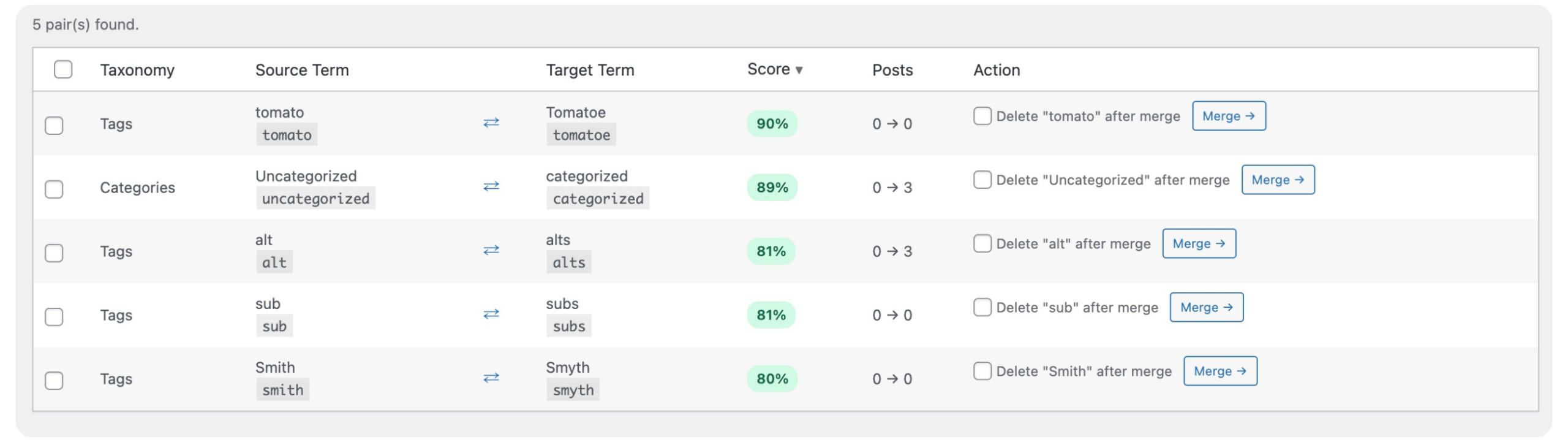 Scans all your tags, categories, and custom taxonomies simultaneously, scoring each pair by similarity so you know exactly where to start.