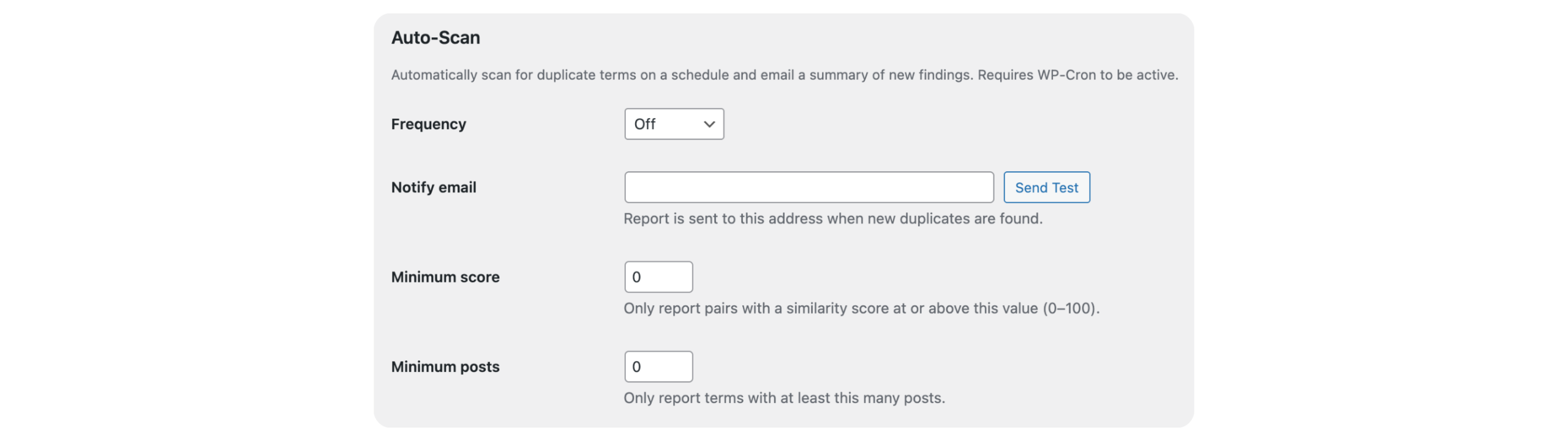 Auto-Scan emails a plain-text report of newly discovered duplicate pairs directly to your chosen address. Send a test email from the settings page to confirm delivery before your first scheduled run.