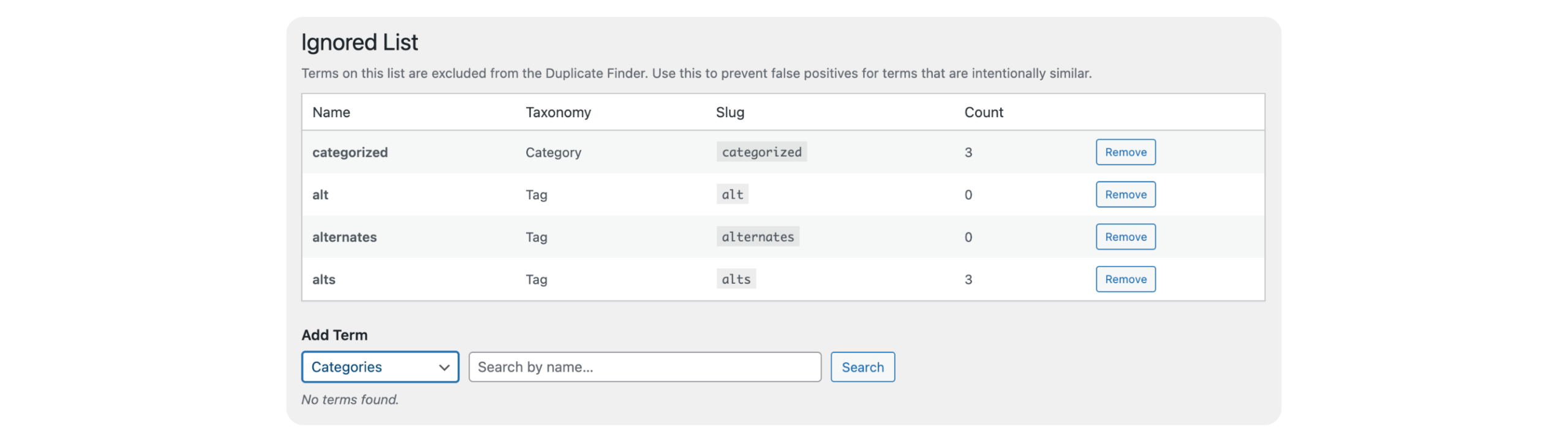 Yes. Terms added to the Ignored List are stored as a site option and excluded from all future scans and auto-scan reports until you explicitly remove them.