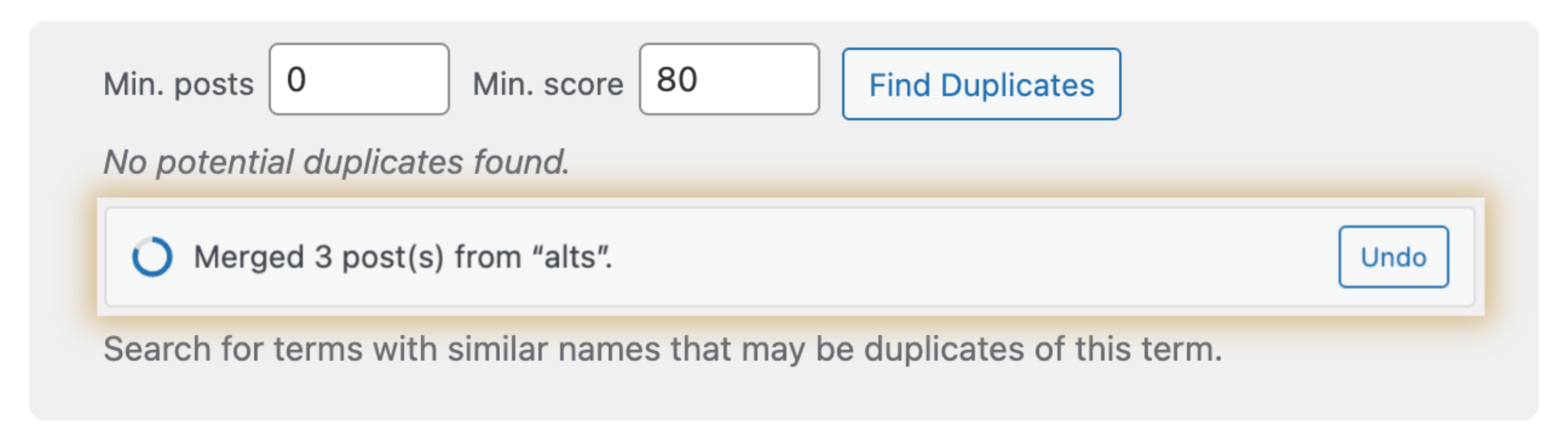 Made a mistake? Undo your most recent merge within 30 seconds. Posts are reassigned, the source term is restored, and its redirect is removed — as if the merge never happened.